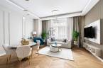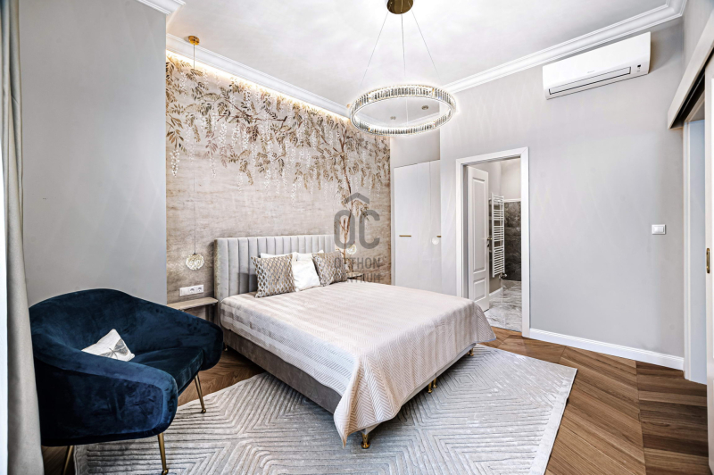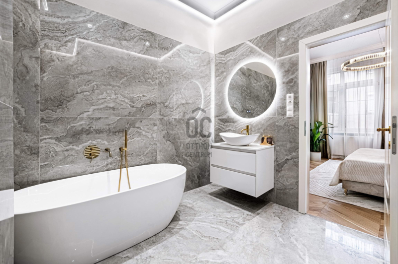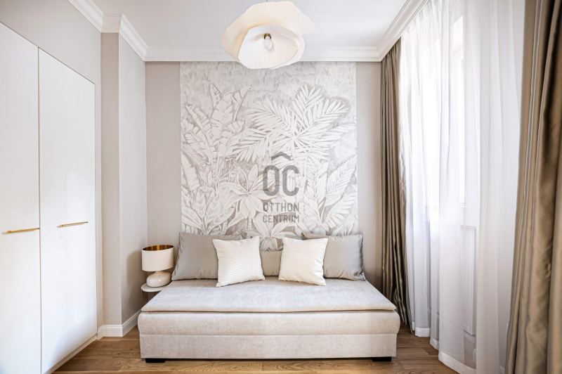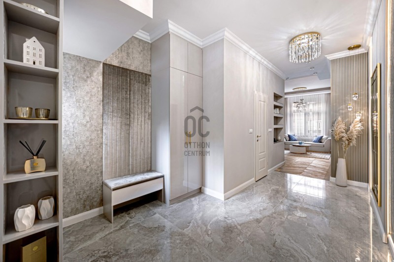 A teljes körű felújítás során megtörtént a víz- és villanyvezetékek, valamint a fűtéscsövek, radiátorok cseréje. Designer csillárok, beépített szekrények, minőségi szaniterek és prémium burkolatok kerültek beszerelésre. A 3,30 méteres belmagasság és a chevron mintás tölgyfa parketta különleges, elegáns hangulatot kölcsönöz az otthonnak. A konyha teljesen gépesített, AEG márkájú készülékekkel felszerelt: mosogatógép, hűtő fagyasztóval, sütő, mikró, főzőlap, páraelszívó és mosógép is rendelkezésre áll. A lakás kényelmét két légkondicionáló és automata redőnyök plusz sötétítők biztosítják.
