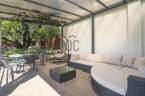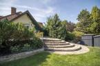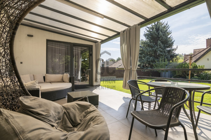 A teraszról nyílik a hatalmas, gondozott kert, melynek a végére építettek egy 1 szobás, modern nyári lakot egy nagy, elegáns , modern terasszal.