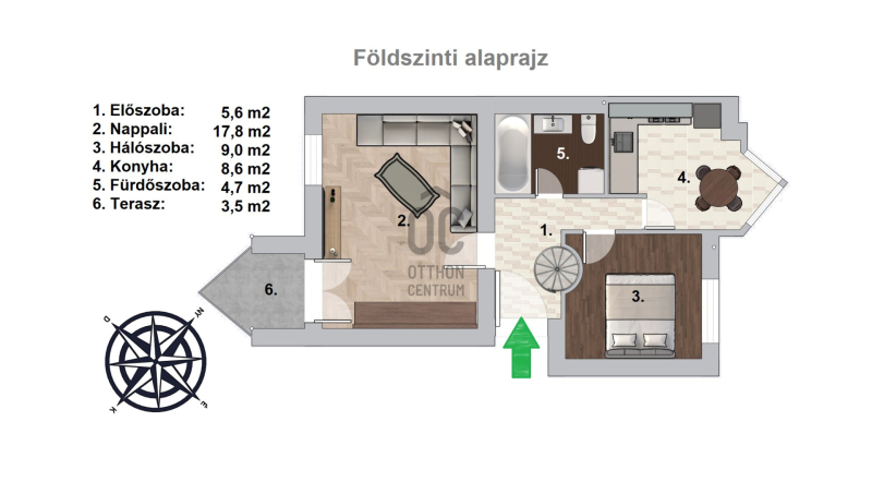 - Felosztása a felső szinten: előszoba, nappali, 1 hálószoba, konyha, fürdőszoba-WC, terasz.
