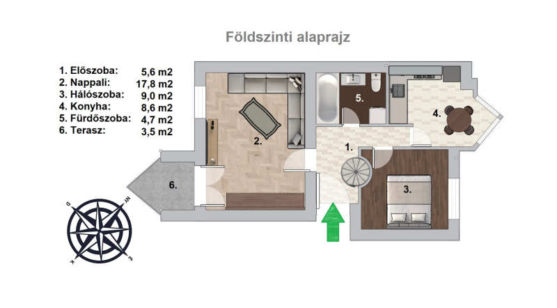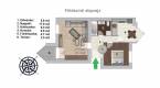 - A nappali délkeleti, a hálószoba és a konyha északnyugati tájolású.