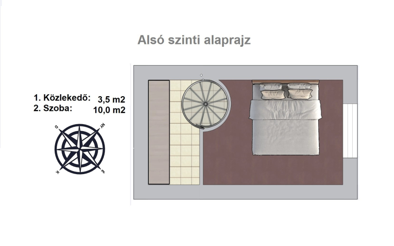 - Felosztása az alsó szinten: közlekedő, szoba.