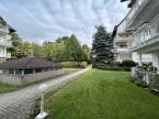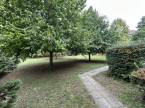 Gondozott parkos kert piknikező hellyel és játszótérrel.