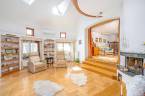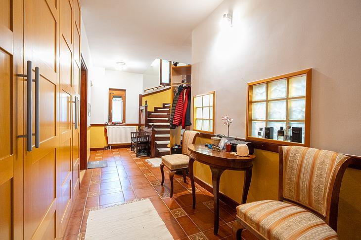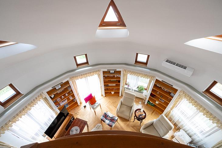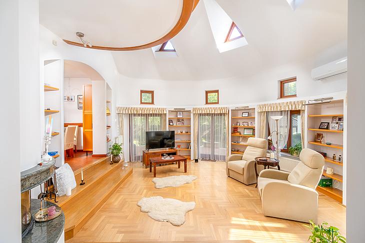 A 1998-ban épült, masszív, 38 cm-es Porotherm téglából készült épületet az eredeti építtető és tervező gondos odafigyeléssel tájolta, a belső tereket pedig funkcionálisan és esztétikusan alakította ki. A ház egyik különleges eleme a szinteltolásos, körcikk alakú nappali, amely galériás kialakításával, kandallójával és nagy belmagasságával lenyűgöző központi teret biztosít – ez a ház valódi szíve.