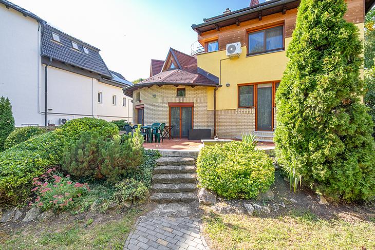 A kert és az udvar külön figyelmet érdemel: 2015-ben teljesen megújult, dísznövényekkel, amerikai tulipánfával, japán birssel, sziklakerttel és automata öntözőrendszerrel felszerelve. A hátsó udvar csendes, intim részében grillező és tűzrakóhely került kialakításra, beton térkő sétánnyal – a baráti összejövetelek kedvenc helyszíne lehet. A gyep alá vakondháló került, így mindig rendezett, zöld környezet várja az új tulajdonosokat.