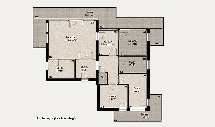 A nappali mellett található az étkező és a szintén teraszkapcsolatos konyha. A lakás hálószobái világosak és jól szeparáltak, a privát élettér tökéletesen biztosított.