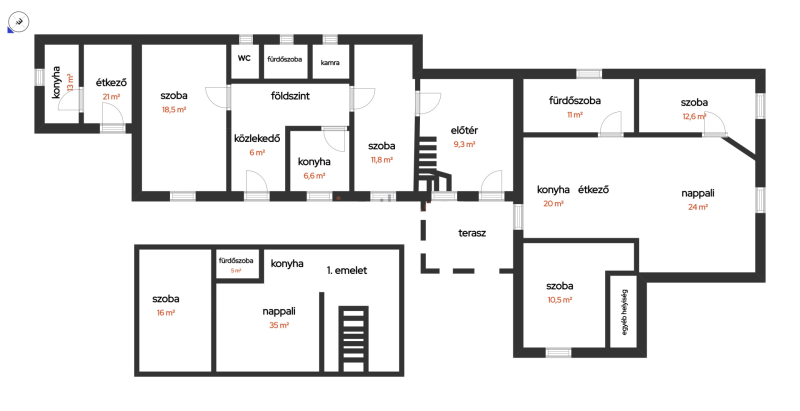Tartozik még az épülethez egy külön bejáratú épületi rész emelyben szintén megtalálható egy konyha és egy étkező.