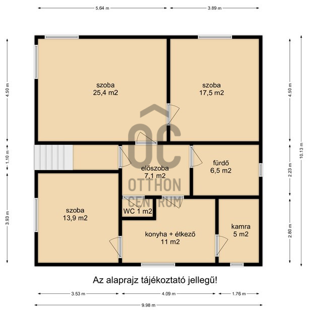 Tájolás: Kelet–Nyugat, így a ház napfényes és világos.