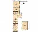 Az elsődleges lakrészbe 3 bejárati lehetőség nyílik: az előkertről a nagyszobába, egy előszobába, valamint az amerikai konyhás nappaliba. A melléképületben kialakított lakrész külön bejárattal rendelkezik. Az ablakok cseréje megtörtént műanyagra, a melléképületben fakeretesek. A fűtést cirkó gázkazán biztosítja lapradiátorokon keresztül, de a két fő szobában gázkonvektor és cserépkályha van beépítve. A garázs jelenleg szobaként funkcionál. A járólapok jó állapotúak.