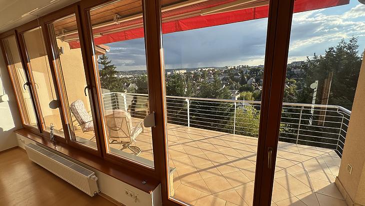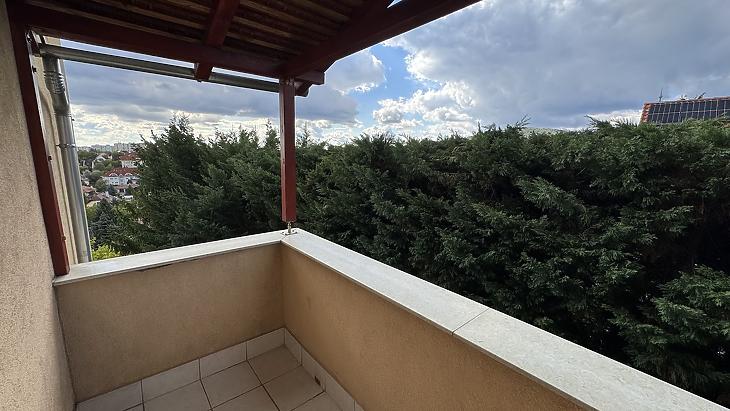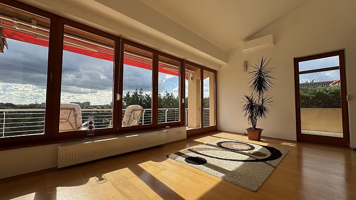 A nappaliból nyílik egy 15 nm-es délnyugati fekvésű, gyönyörű panorámával rendelkező, félig fedett, motoros árnyékolóval ellátott terasz, illetve szintúgy a nappaliból közelíthetjük meg az oldalsó, nyugati fekvésű 5 nm-es, teljesen fedett erkélyt.