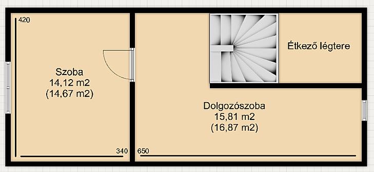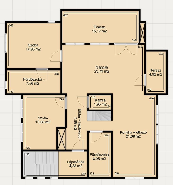 A 24 nm-es nappalin kívül a lakásban 3 hasonló méretű (14 nm) hálószoba található, illetve igény szerint a felső alaprajznál feltüntetett dolgozószobát át lehet alakítani egy teljes értékű 19 nm-es hálószobává. A nappalit, az előteret és a konyha/ étkezőt, középen a szinteket összekötő lépcső osztja meg, melynek aljába egy 2 nm-es kamra is kialakításra került. Az ingatlanban két fürdőszoba található.