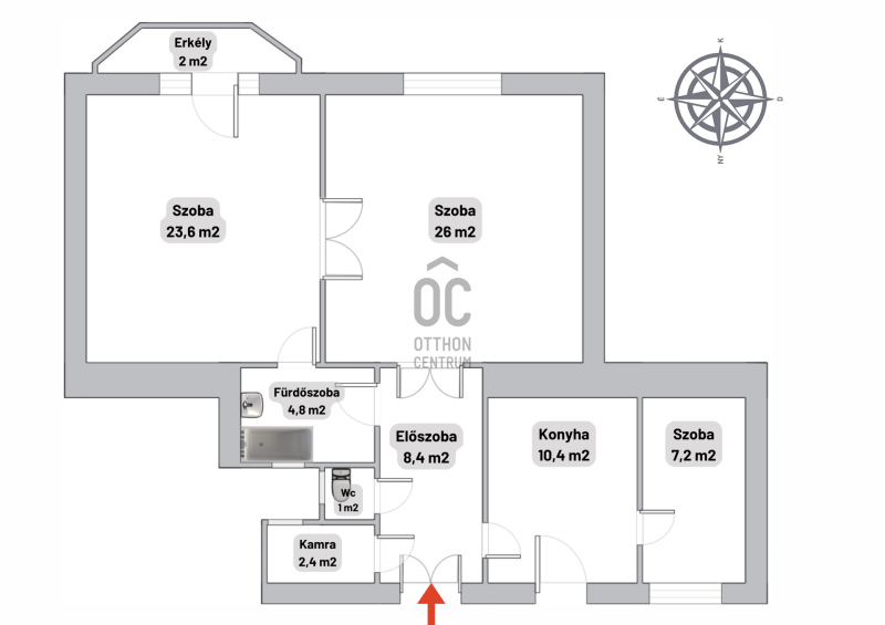 ✅ Jelenlegi felosztása: közlekedő, 3 szoba, konyha, kamra, fürdőszoba, wc, erkély.