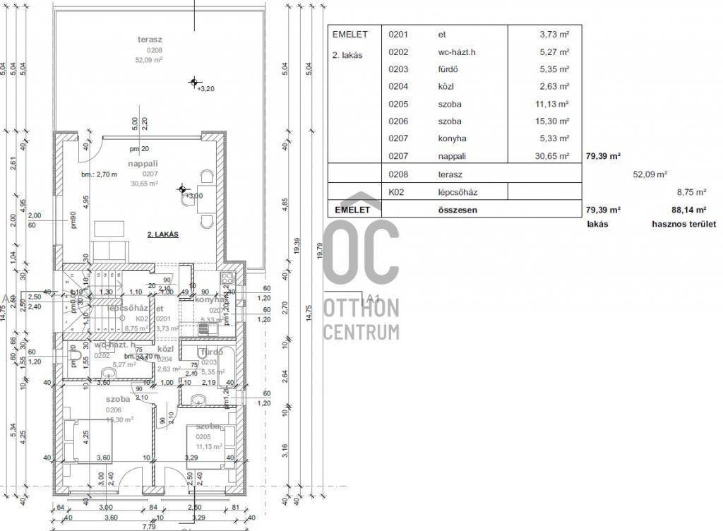 Az első emeleti ingatlan 88nm-es, 3 szobával és 1 fürdőszobával rendelkezik, valamint egy 50- nm-es terasszal.
