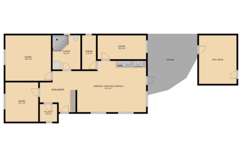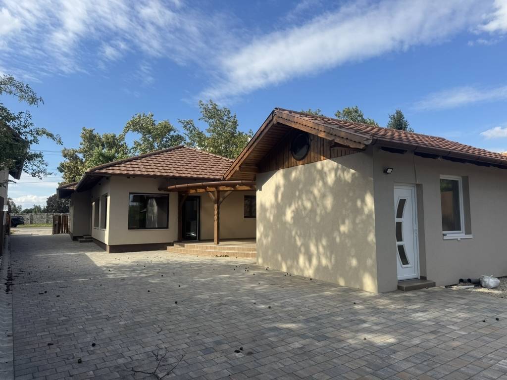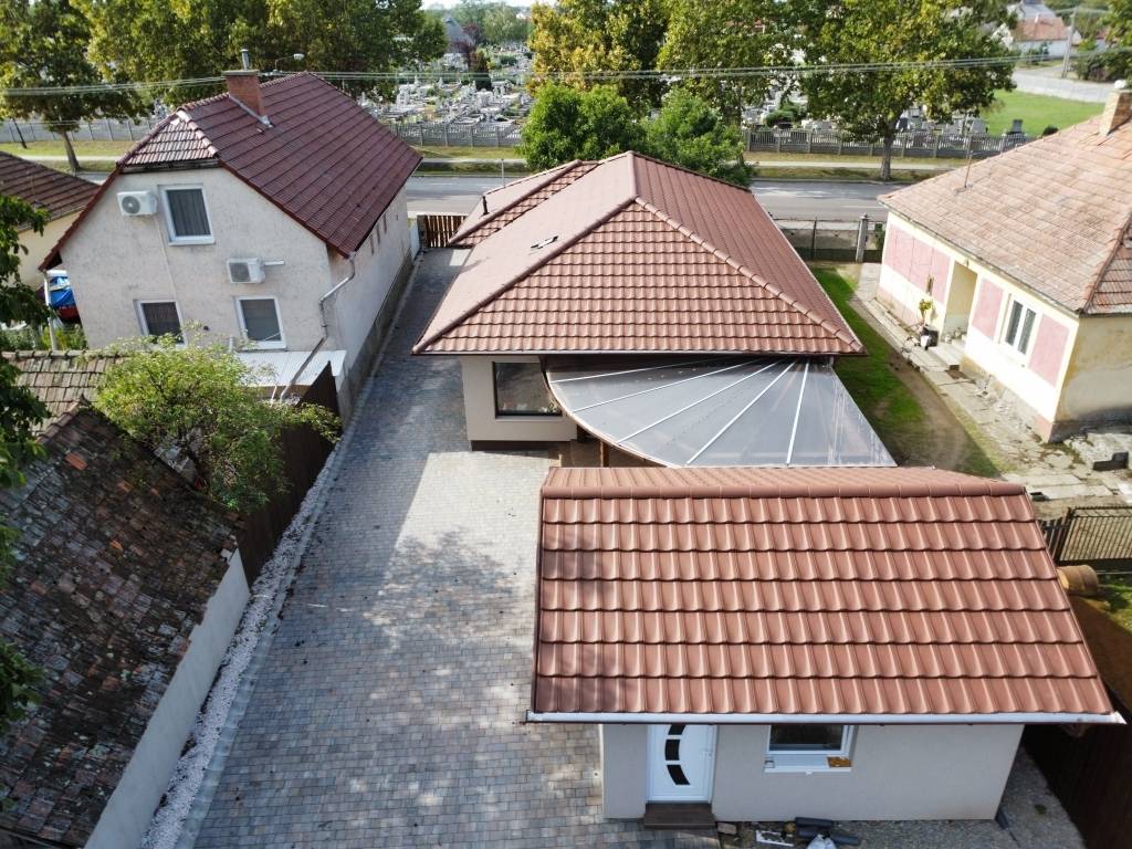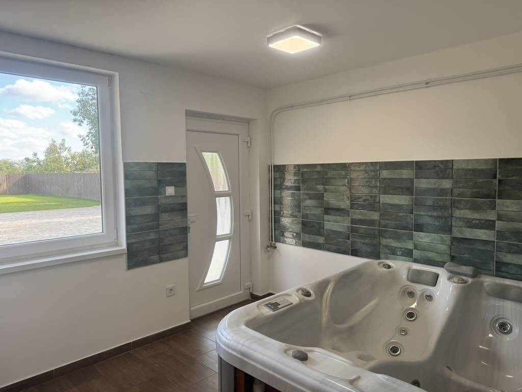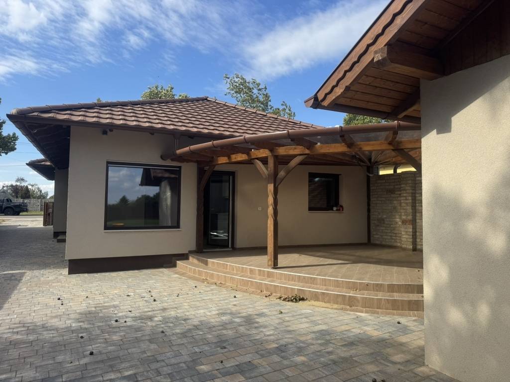 A ház után közvetlenül helyezkedik el a tágas fedett terasz, az ingatlan két bejáratos, így a konyhából kényelmesen kiléphetünk a fedett teraszra. A teraszról nyílik a külön épületben található wellness részleg: jakuzzi és szauna. Mögötte a fedett autóbeálló. A kert egy része szépen füvesített és öntözőrendszer is kiépítésre került!