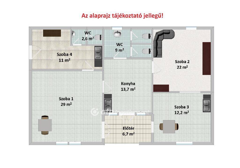 Helyiségek: előszoba (6,7 m2), konyha (13,7 m2), mosókonyha (11 m2), külön WC (2,3 m2), fürdő (9 m2), szobák: 29 m2, 22 m2 és 12,2 m2