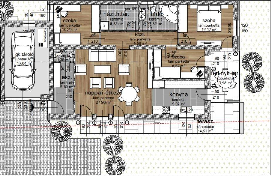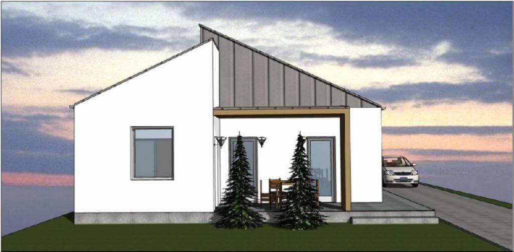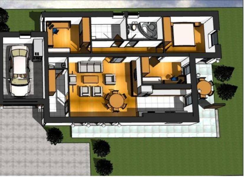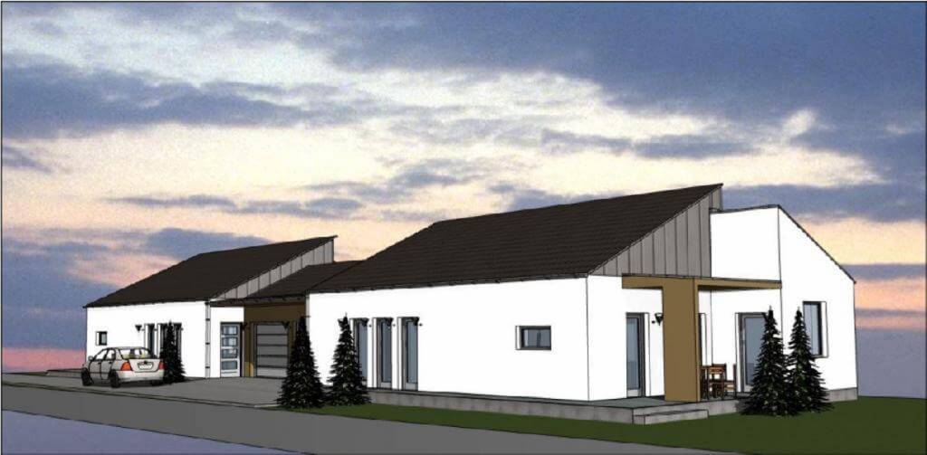 A tervek alapján a ház helyiségei: előszoba, amerikai konyhás-étkezős nappali + 3 hálószoba, fürdőszoba, háztartási helyiség, vendégmosdó, nyitott és fedett terasz, valamint zárt garázs.