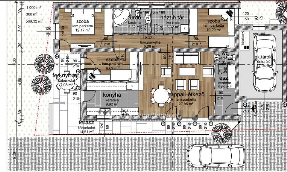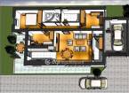 A tervek alapján a ház helyiségei: előszoba, amerikai konyhás-étkezős nappali + 3 hálószoba, fürdőszoba, háztartási helyiség, vendégmosdó, nyitott és fedett terasz, valamint zárt garázs.