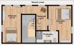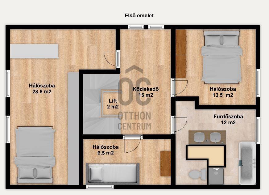 Második emelet: fürdőszoba, közlekedő, két kisebb hálószoba