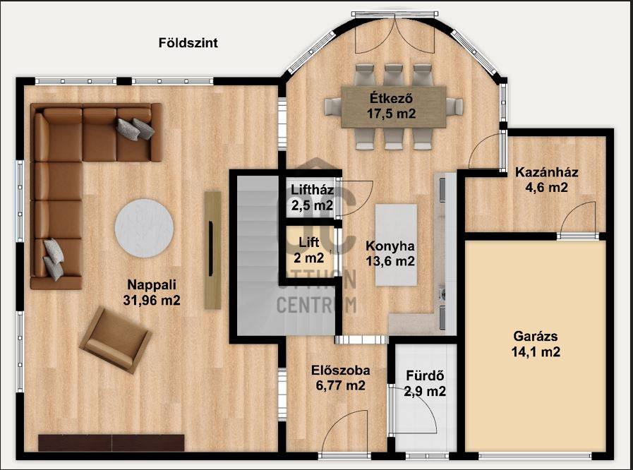 Földszint: előszoba, fürdőszoba, konyha, étkező, nappali, kazánház - melyen keresztül a garázsba jutunk