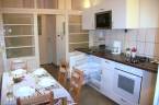 * Konyha és fürdőszoba: a konyhában beépített hűtő és gáztűzhely található, a melegvizet elektromos vízmelegítő szolgálja. A fürdőszobában zuhanyzó, WC, valamint a villanybojler biztosítja a meleg vizet.