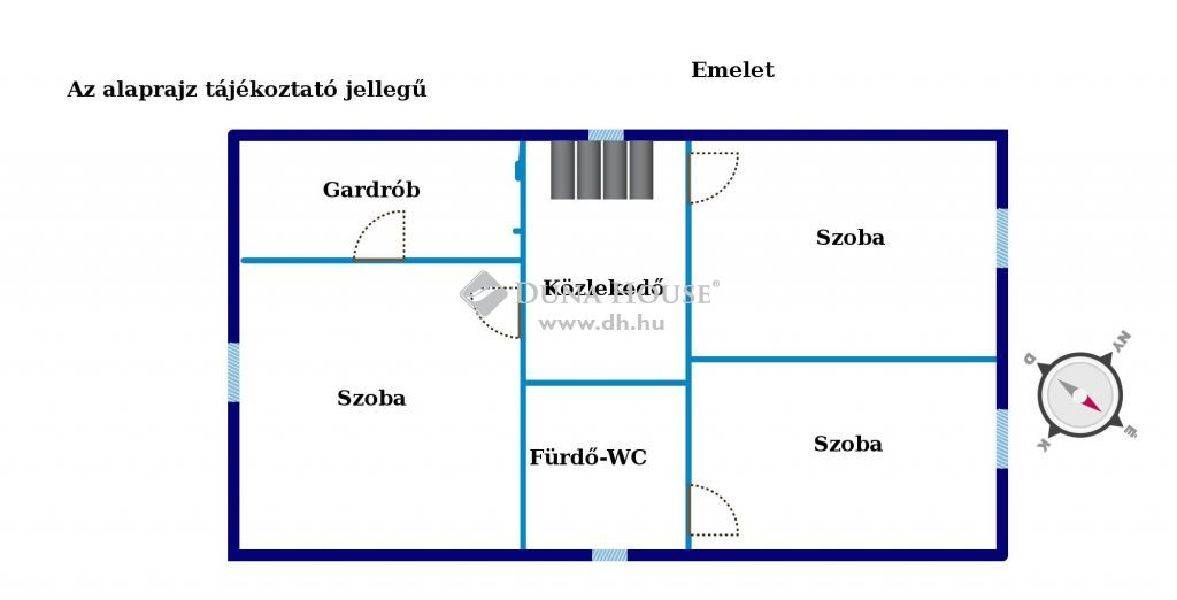 Világos közlekedőn keresztül jutunk fel az emeletre, ahol három szoba, erkéllyel valamint fürdőszoba WC-vel és gardrób lett kialakítva.