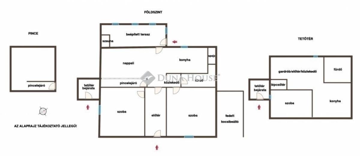 Földszint: nappali, konyha, 3 szoba, fürdőszoba + WC, közlekedő, beépített terasz szaunával