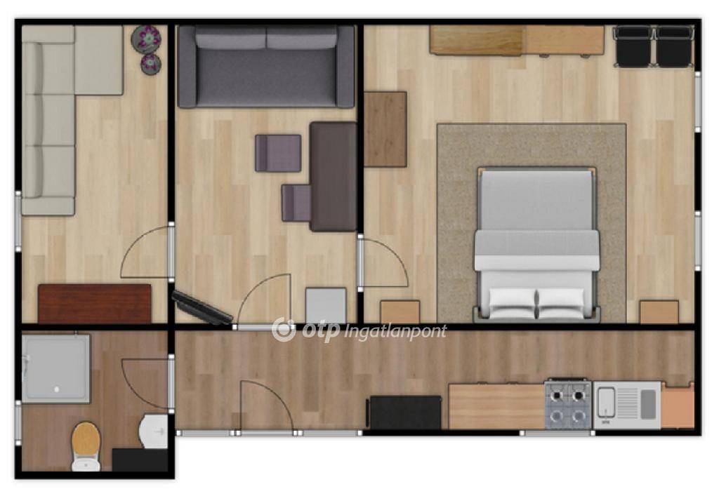 Helyiségei: 1 szoba + 1 félszoba , nappali, fürdő + wc ,közlekedő ,konyha.