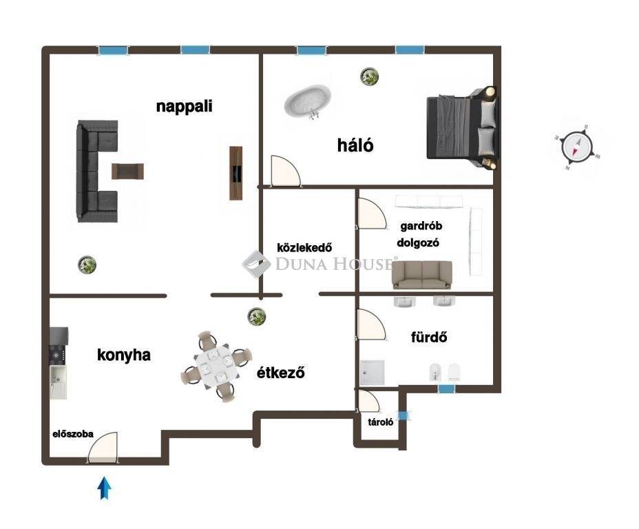 - Nappali + 1 szoba, gardrób vagy dolgozószoba, konyha + étkező, fürdőszoba+ wc
