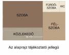 A ház elosztása: előszoba, szoba, félszoba, fürdőszoba és külön WC. Tartozik hozzá egy 13 nm-es kazánház, egy 15 nm-es garázs, valamint egy 22 nm-es nyári konyha, amely előszobából, szobából és tárolóból áll. Az ingatlan teljes hosszában fedett terasz kapcsolja össze a főépületet a nyári konyhával.