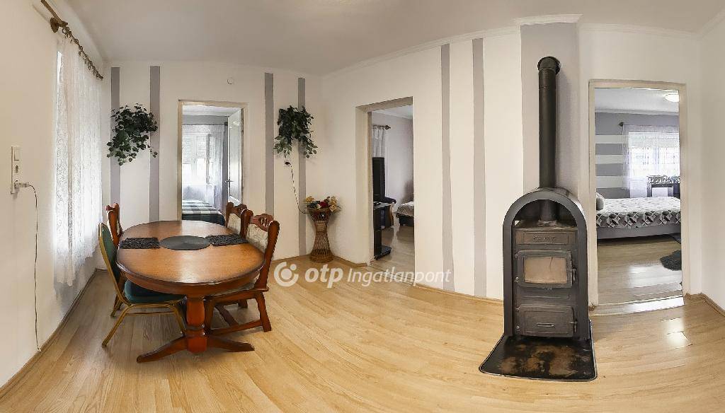 Az ingatlan a település központjától mindössze néhány percnyi sétára, egy nyugodt mellékutcában található; 1370 m2-es telek, garázs, egyéb melléképületek tartoznak hozzá. A szerkezetileg stabil, beton alapra épült, tégla falazatú ház tetőszerkezetét síkpala héjazat fedi. A külső falak esztétikai szempontból még felújításra szorulnak, ugyanakkor a belső terek korszerűsítése a közelmúltban történt. A 2 bejárattal rendelkező lakóépület délnyugati homlokzata előtt 6,6 m2-es hidegburkolattal ellátott, fedett terasz húzódik, mely igény szerint beépíthető. A házon belül összesen 9 helyiséget - 3 szobát, 1 félszobát, 1 konyhát, 1 étkező-nappalit, 1 fürdőszoba-WC-t, 1 előszobát, és 1 közlekedőt - alakítottak ki. Tervben van a konyha bővítése a főzőfülkeként is használt, vízvezetékkel ellátott közlekedő irányába. A belső felújítás során új aljzatbeton készült; a konyhát, és a tusolóval felszerelt fürdőszobát járólappal burkolták, a többi helyiségbe laminált parketta került. A nyílászárókat (egy bejárati ajtó kivételével) mind cserélték: a modern műanyag hőszigetelt ablakokat redőnnyel szerelték fel; a fehérre festett beltéri ajtók fából készültek. A házban az áram-, a víz-, és a csatornahálózat teljesen megújult. A gázt nem kötötték be, a gázcsonk az udvarban rendelkezésre áll. A gipszkartonnal borított belső falak kőzetgyapot hőszigetelést tartalmaznak. Az otthon melegéről hagyományos fűtés, fatüzelésű kandalló gondoskodik, a meleg vizet villanybojler biztosítja. Kiváló elrendezésének köszönhetően az ingatlan tökéletes választás lehet nagyobb családok számára is; állapotát tekintve azonnal költözhető, per- és tehermentes, falusi CSOK igénylésére alkalmas.
