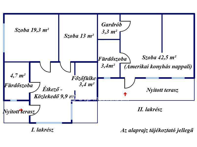 * egy légterű, tágas, 42 nm-es helyiség derékig érő fallal osztva, stúdió jellegű nappali-konyha