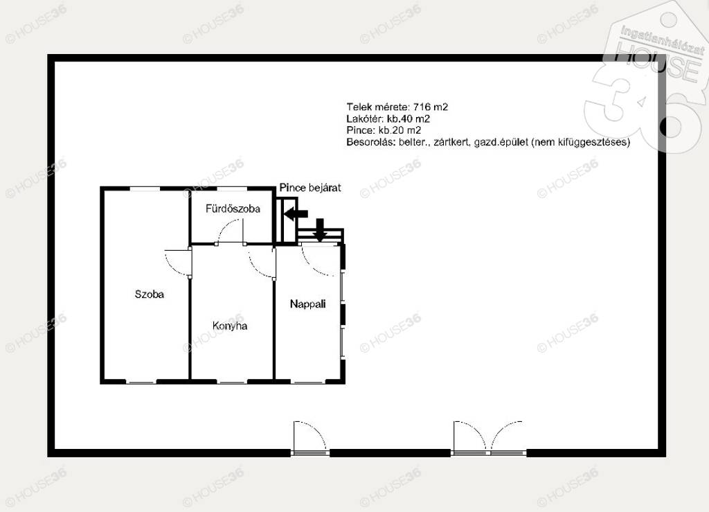 - Lakótér: br.40 m2 : nappali, konyha, fürdőszoba, hálószoba