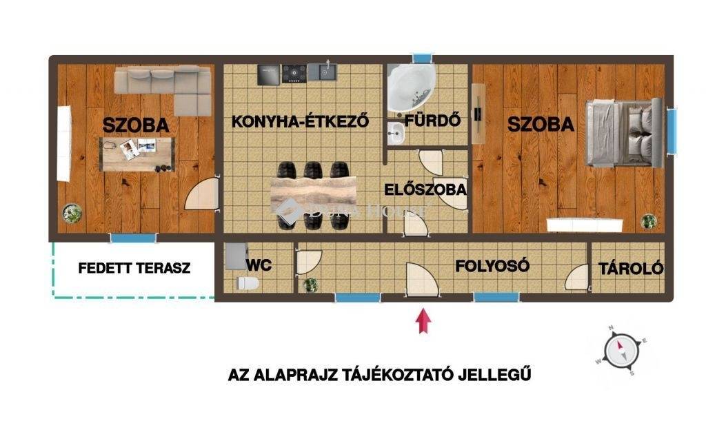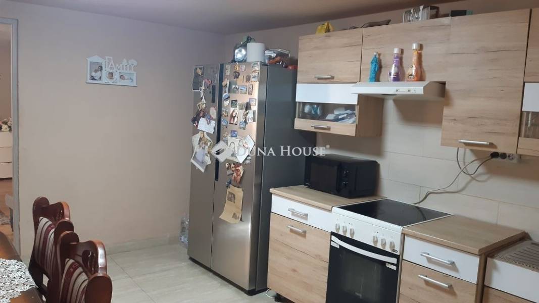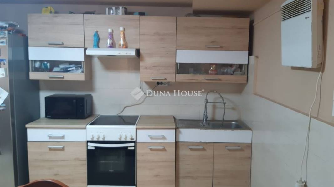 A házban mindkét szoba laminált padlóburkolattal rendelkezik, a tágas konyha és étkező egy légtérben található, így kellemes, otthonos légkört biztosít. A fürdőszoba néhány éve teljes felújításon esett át, a WC külön helyiségben kapott helyet.