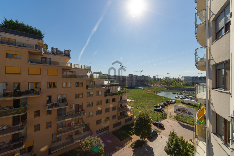XIII. Marina parton, 2011-ben átadott társasház 5.emeletén, 51 m² alapterületű + 11 m² teraszos, Foka-öbölre és Dunára részpanorámával rendelkező, tágas, kétszobás otthon eladó.