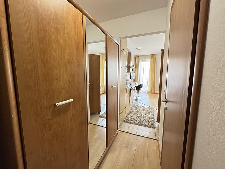 A lakás teljesen bútorozott és gépesített, minden szükséges eszközzel felszerelve: mosógép, mosogatógép, mikrohullámú sütő, beépített hűtő és fagyasztó is a bérlő rendelkezésére áll. A nappali, étkező és konyha egy légtérben helyezkednek el, emellett külön fürdőszoba és előszoba is van. A lakás mérete és kialakítása miatt leginkább egyedülállóknak ideális.
