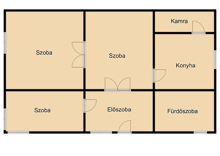 A ház jelenlegi elosztása 3 szobából, konyhából és egy fürdőszobából áll.