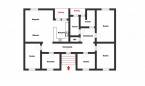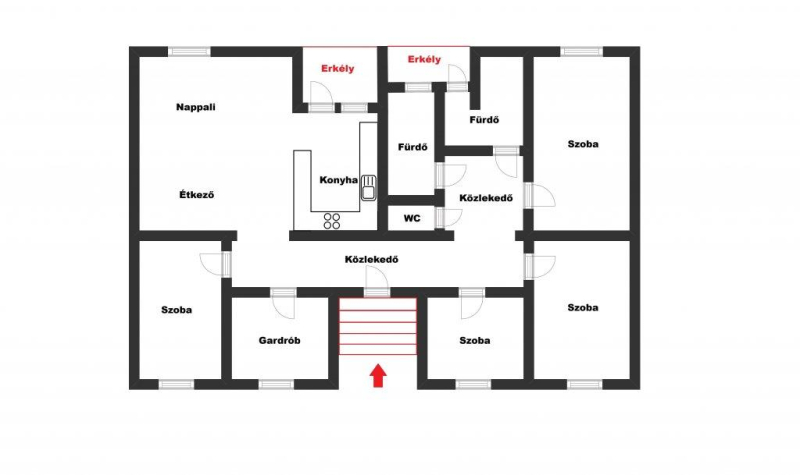 - elosztása: konyha + nappali + étkező, 5 szoba, 1 fürdő +WC, 1 fürdő, 1 WC, közlekedő, 2 erkély