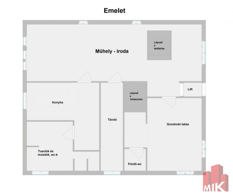 A három szint összesen bruttó 480 m2 alapterületen nettó 360 m2 hasznos területet biztosít egy vállalkozás termelőtevékenységéhez, raktározásához, avagy kereskedelméhez.