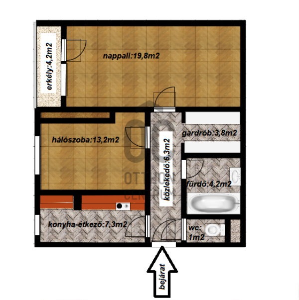 A lakás elrendezése: nappali + 1 hálószoba, konyha, fürdőszoba, külön mellékhelyiség, méretes gardrób, közlekedő és egy tágas erkély.