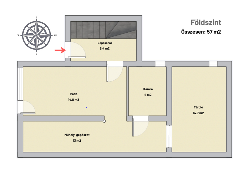 - Előszoba, iroda, kamra, műhely, tároló szoba, gépészet.