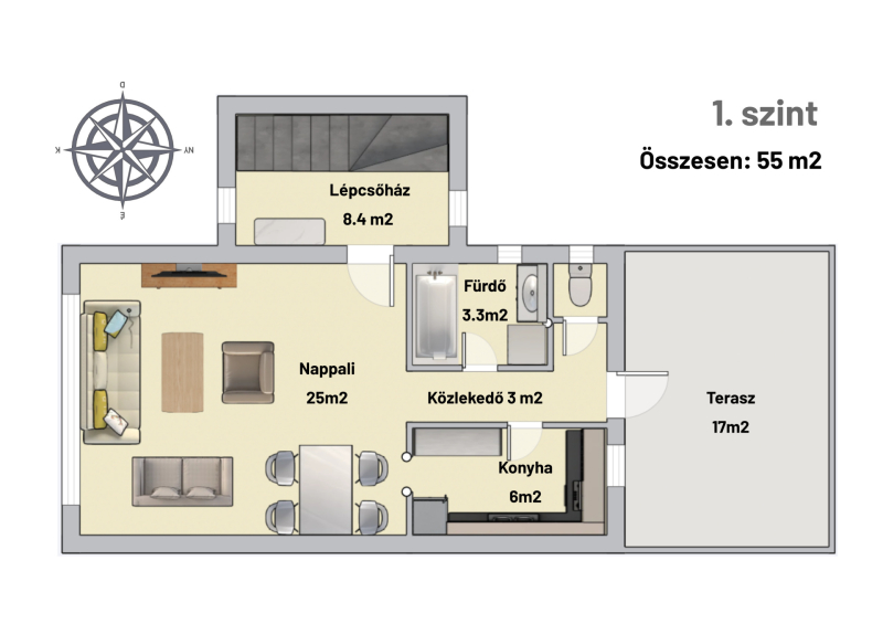 - A nappali tájolása keleti, belmagassága 260 cm.