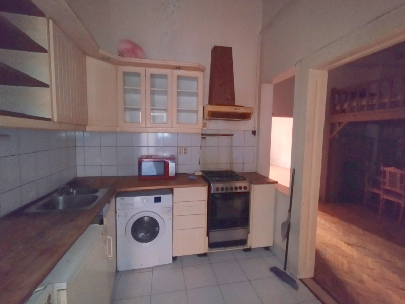 A konyhában minden kézre esik, ráadásul van egy átadó ablak is, ha a galéria alá külön étkezőt terveznél. A korábbi bérlők sajnos nagyon lelakták, ezért teljes körű felújítás szükséges.