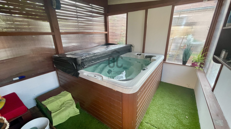 Az udvaron kapott helyet a 22 négyzetméteres fedett terasz, amely téliesíthető, így a 6 személyes jakuzzi egész évben kihasználható.