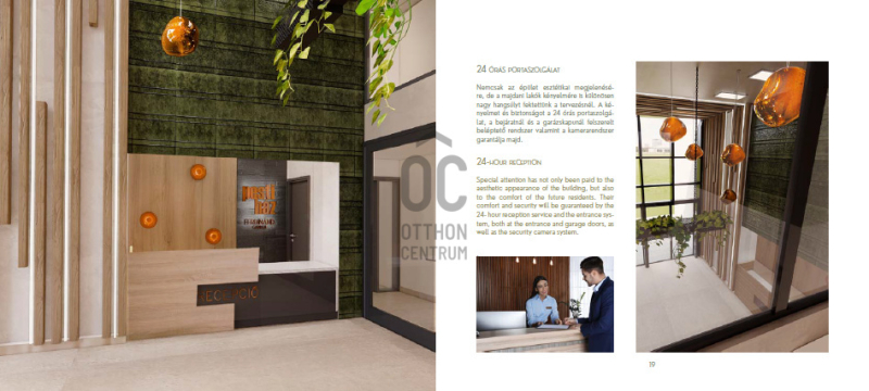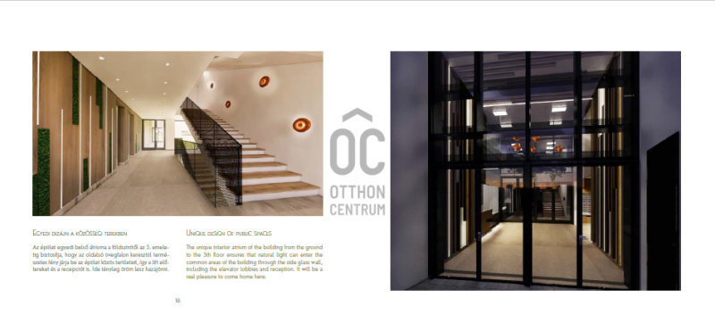 Az épület egyedi belső átriuma a földszinttől az 5. emeletig biztosítja, hogy az oldalsó üvegfalon keresztül természetes fény járja be az épület közös területeit, így a lift előtereket és a recepciót is. Ide tényleg öröm lesz hazajönni. Nemcsak az épület esztétikai megjelenésére, de a majdani lakók kényelmére is különösen nagy hangsúlyt fektettünk a tervezésnél. A kényelmet és biztonságot a 24 órás portaszolgálat, a bejáratnál és a garázskapunál felszerelt beléptető rendszer valamint a kamerarendszer garantálja .