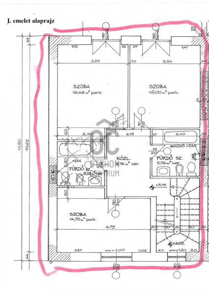 I. emelet (74,4 m²): 3 helyiség, fürdőszoba, WC, terasz