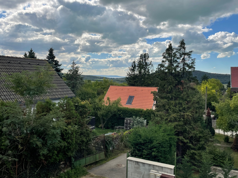 Az emeleti ablakból a Balaton víztükre is megcsillan a távolban.
