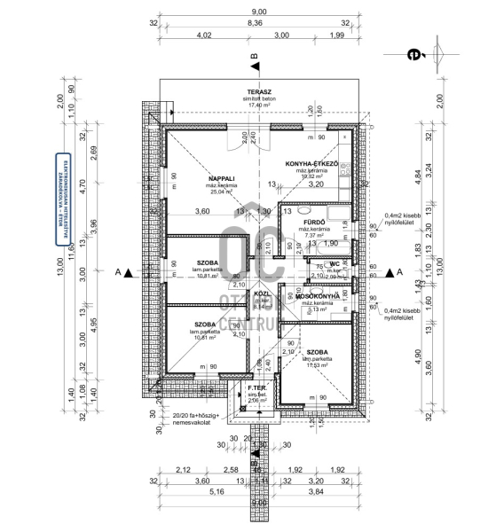A nappali közvetlen kijárattal kapcsolódik a 17 m²-es teraszhoz, amely a mindennapok kényelmét szolgálja. A 603 m²-es telek bőséges lehetőséget kínál kert, játszótér vagy pihenőterület kialakítására.