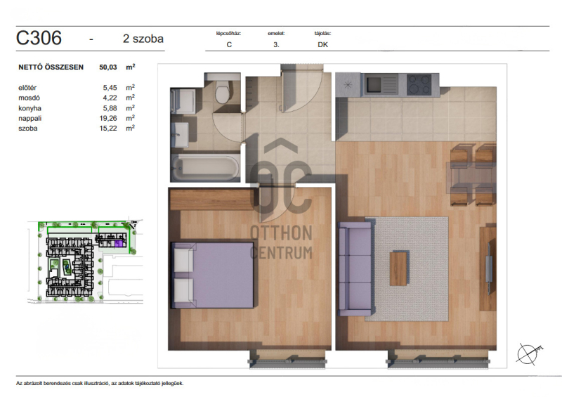 - széles körű lakáskínálat: a modern kialakítású lakások nappali+1 szobás, illetve nappali+2 szobás elrendezésben érhetők el. Néhány földszinti lakás kertkapcsolattal is rendelkezik, automata öntözőberendezéssel.