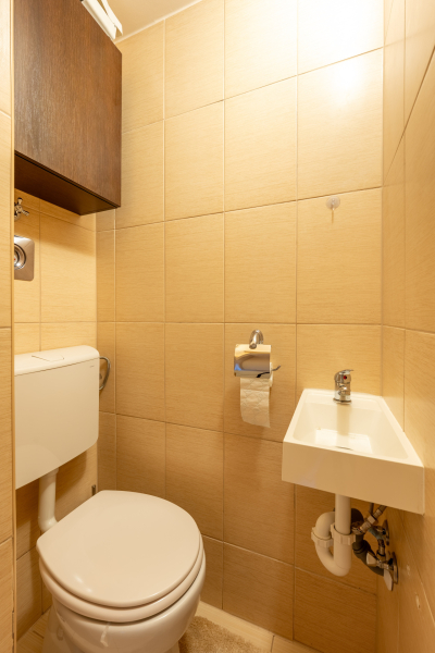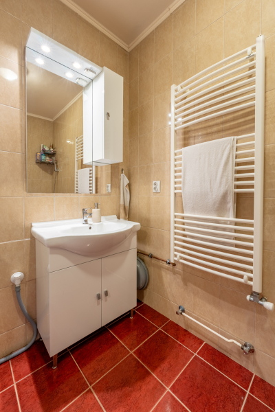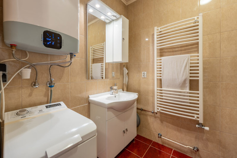 A fürdőszoba ablakos, a WC külön helyiségben kapott helyet, a fűtést gázcirkó biztosítja.