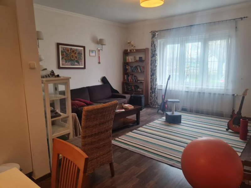 A földszinten egy konyha-nappali-étkező ,WC kézmosóval, fürdőszoba (WC-vel) található. A ház alápincézett. A pincébe egy képcsőn lehet lejutni. A 30 nm-es pincében levő Bosch Condense kazán biztosítja fűtést és a használati melegvizet. A földszinten 3 darab inverteres klíma is van. A nappali és hálószoba falban egy téglakályha, tömegkályha van. Ez a tömegkályha képes befűteni az egész földszintet. Szoba területek: 36 nm konyha-nappali-étkező, hálószoba 20 nm, dolgozó szoba 12 nm.