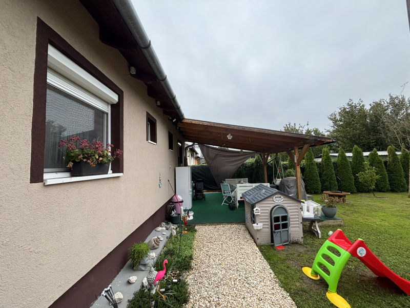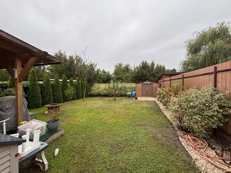 A házhoz tartozik egy hangulatos terasz, amely tökéletes helyszín a pihenéshez vagy családi, baráti összejövetelekhez. A gondozott kert zöld környezete igazi otthonosságot biztosít, míg a tároló kényelmes megoldást kínál kerti és háztartási eszközök elhelyezésére.